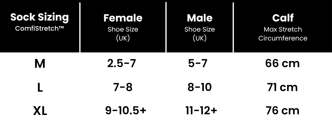Comfisox ComfiStretch™ Socks feature innovative pressure-free technology, stretching up to 30cm to gently conform to your legs. Designed to fit all leg and foot sizes, they deliver unmatched comfort and support for all-day wear.